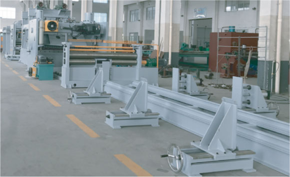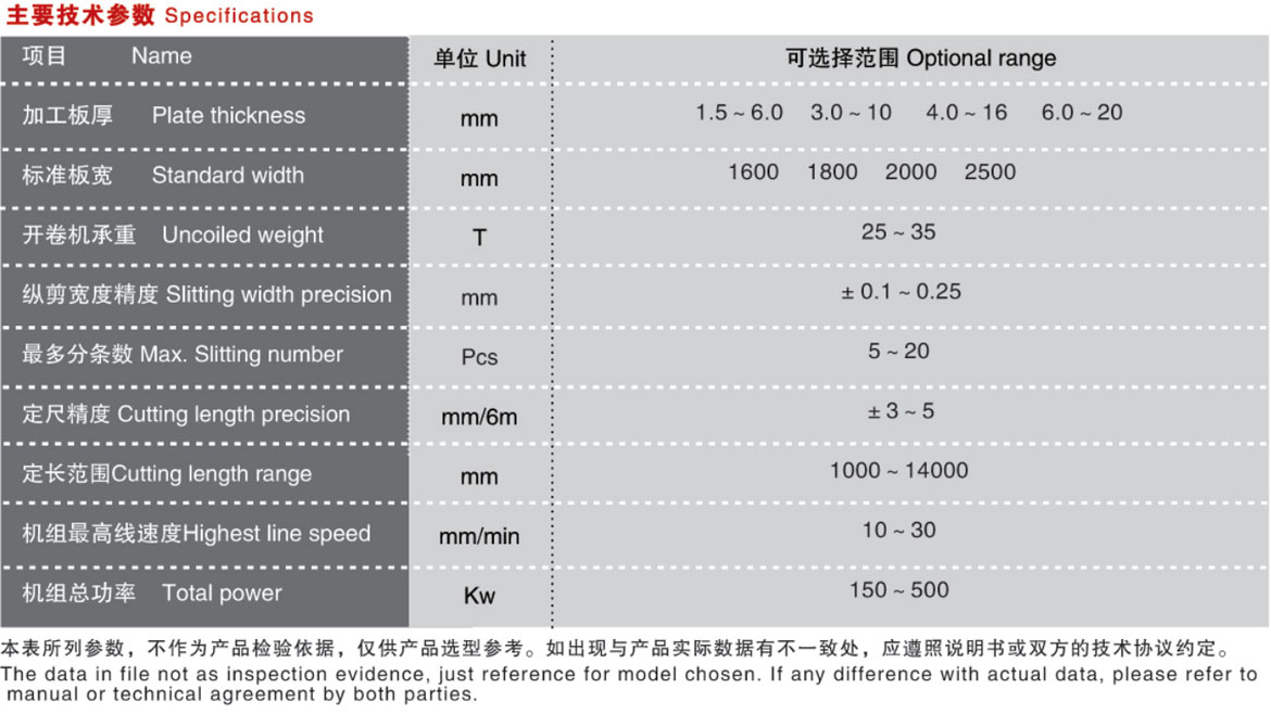 由上料小車、開卷機、引頭裝置、牽引夾送及粗校、過渡臺、對中裝置、縱剪主機、校平主機、剪板機、落料出料裝置等組成,可另外選配廢邊卷取裝置。